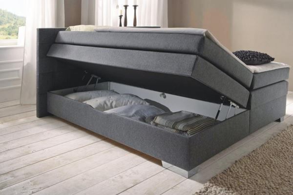 Polsterbett beige mit bettkasten hochklappbar 160 x 200 cm.