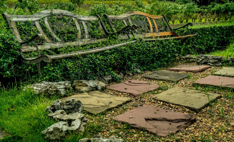 Hölzerne und metallbank im leeren park mit garten. Hölzerne und metallbank im leeren park mit garten. Will man aber länger auf einer metallbank sitzen, so empfiehlt sich eine passende bankauflage. Preis ab 198,34 euro (06.10.2020).